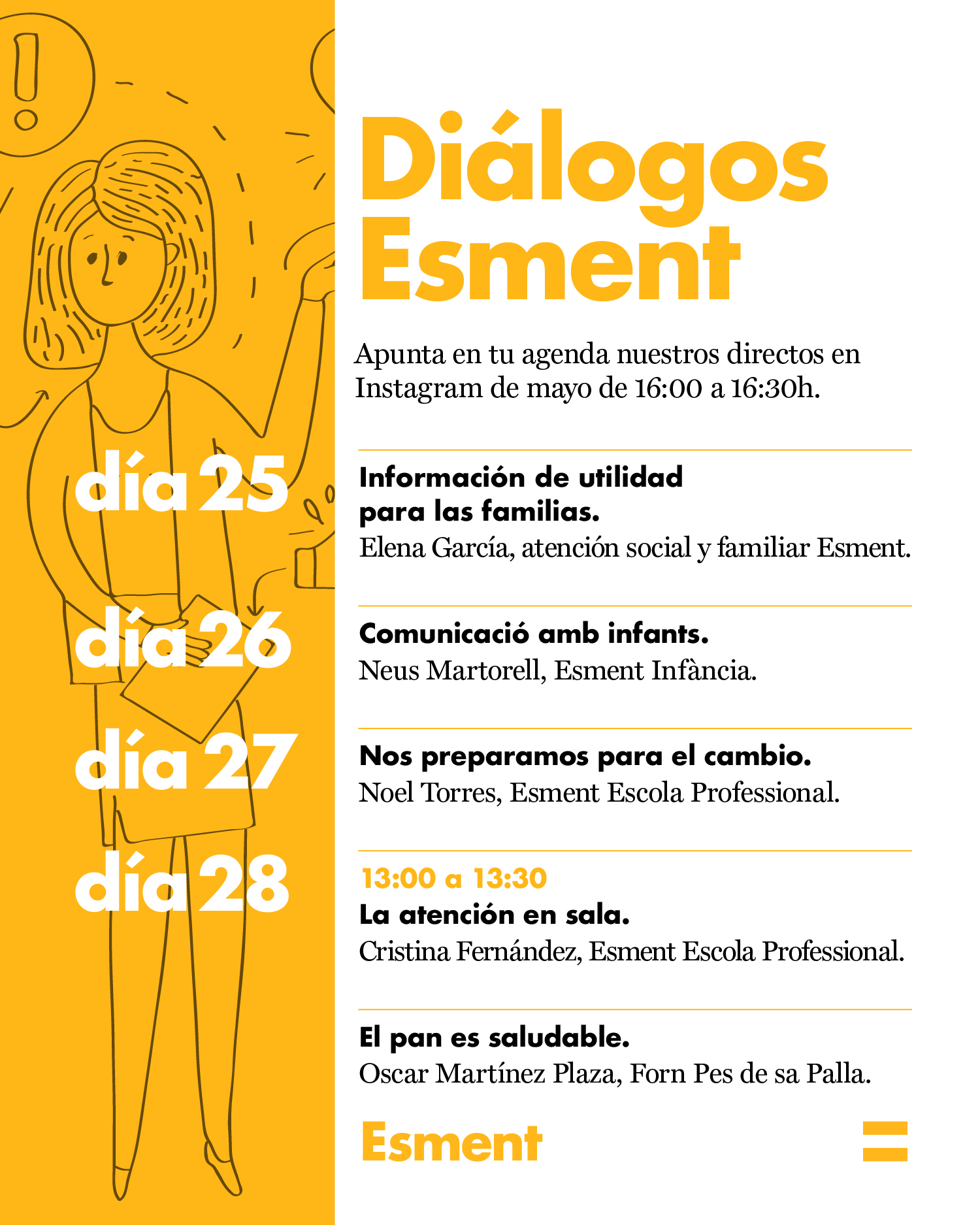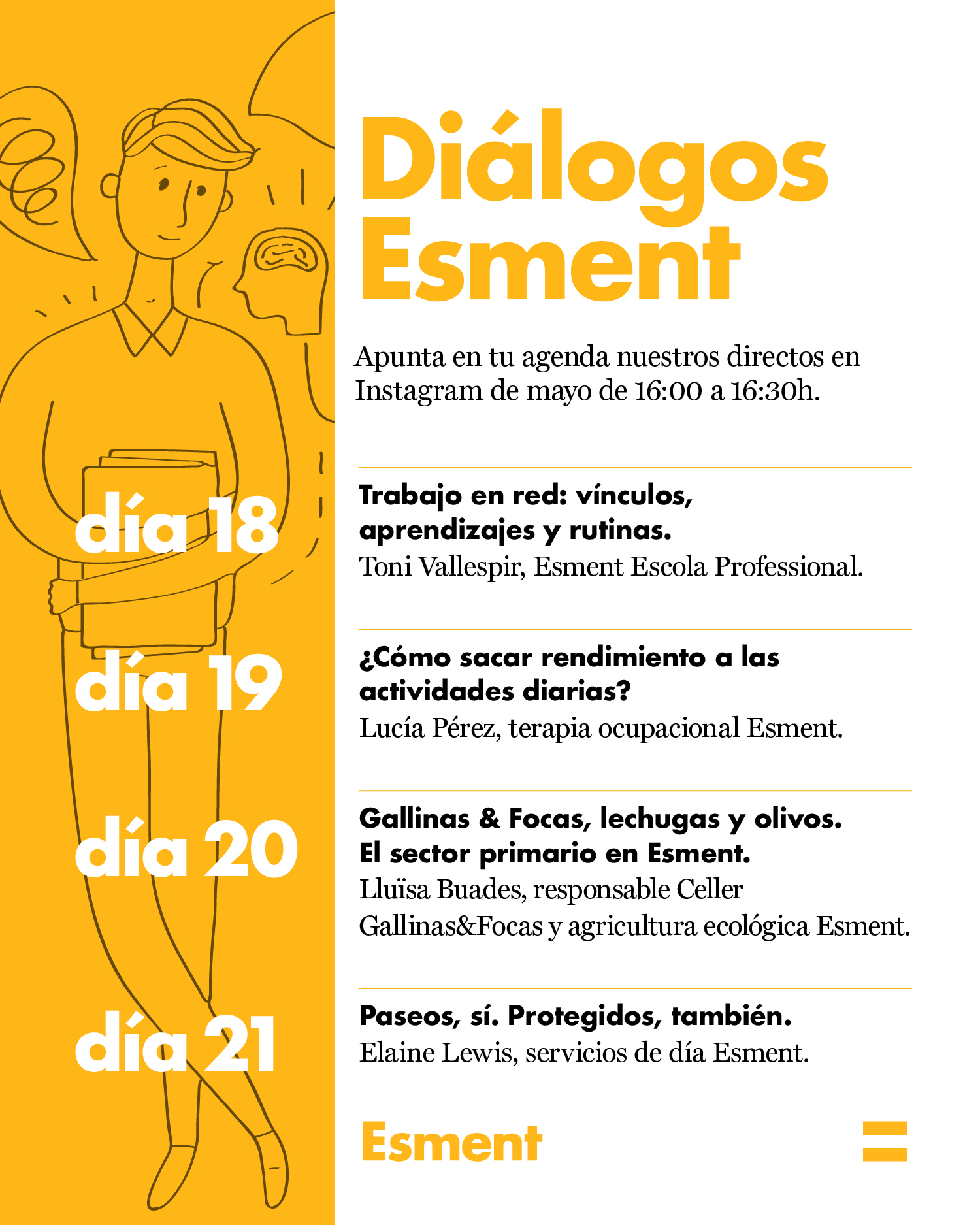 Desde esta semana, cada tarde, entre las 16:00 y las 16:30 horas, realizaremos un directo en Instagram para compartir experiencias, buenas prácticas y formas de trabajar… Entre otros temas, hablaremos sobre cómo trabajamos con los más pequeños, qué actividades realizamos para seguir manteniendo vínculos con nuestros amigos, cómo podemos sacarle rendimiento a nuestras actividades diarias desde el punto de vista de la terapia ocupacional, cómo practicamos nuestras salidas y, también, charlaremos sobre el sector primario en Esment… ¡Os esperamos en Instagram, Diálogos Esment, de lunes a jueves, a las 16:00 horas!