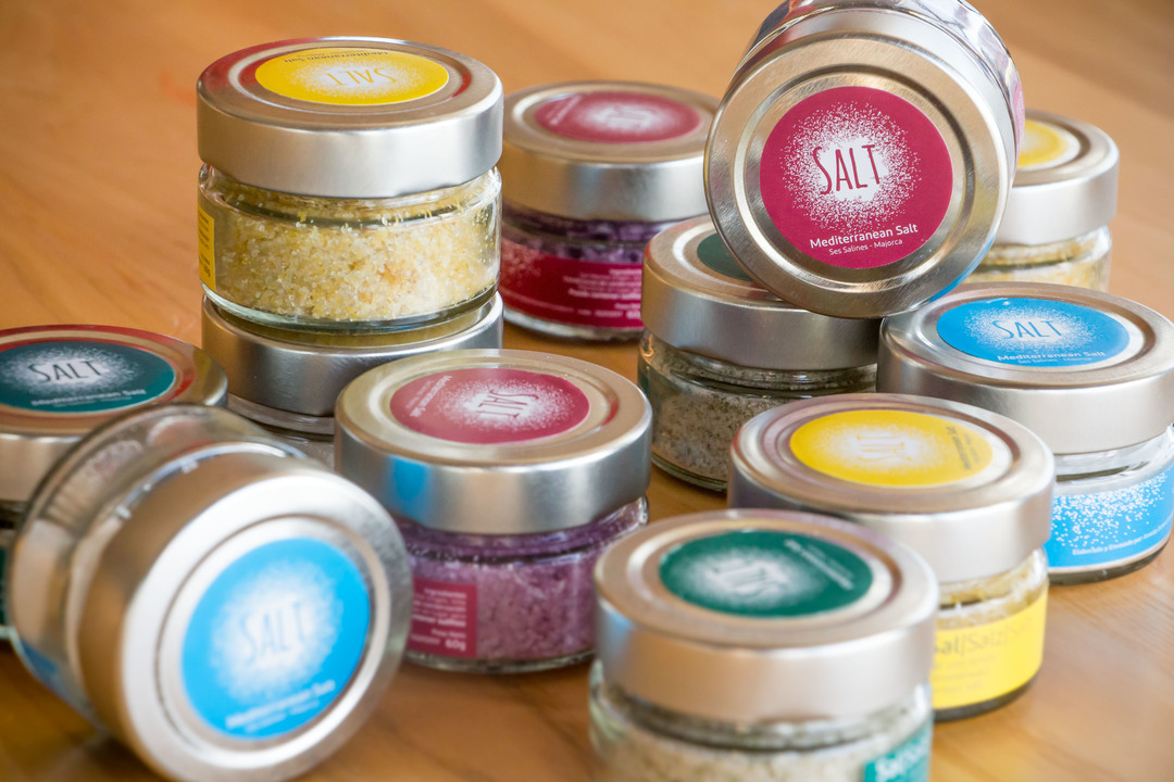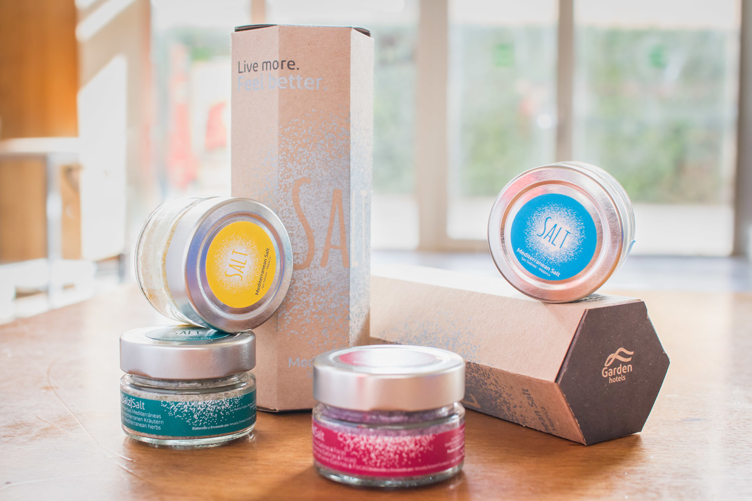 Esment Impremta y Esment Alimentació han elaborado sales aromatizadas para Garden Hotels. El resultado es un producto totalmente artesano, moderno y muy vinculado a los sabores mediterráneos. Para la aromatización de la sal se han seleccionado materias primas naturales: hierbas aromáticas de cultivo ecológico, limones mallorquines que se usan en la elaboración de Pep Lemon (bebida que elabora Esment Alimentació) y el vino Gallinas & Focas. Además del proceso agroalimentario, también se ha realizado el empaquetado y etiquetado de los botes.