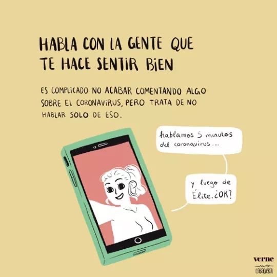 - Habla con gente que te haga sentir bien. No es necesario estar todo el tiempo hablando sobre el coronavirus. Hay muchos temas y son muy interesantes y divertidos.