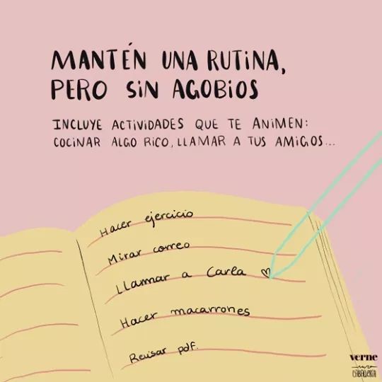 - Hay que tener una rutina, pero no hay que agobiarse. En tu horario, incluye algunas actividades que te gusten, como llamar a tus amigos o hacer algo de ejercicio.