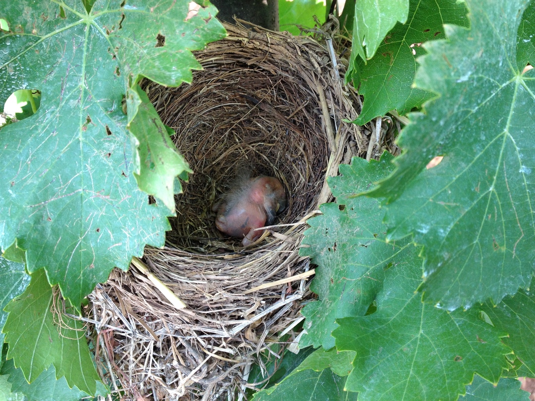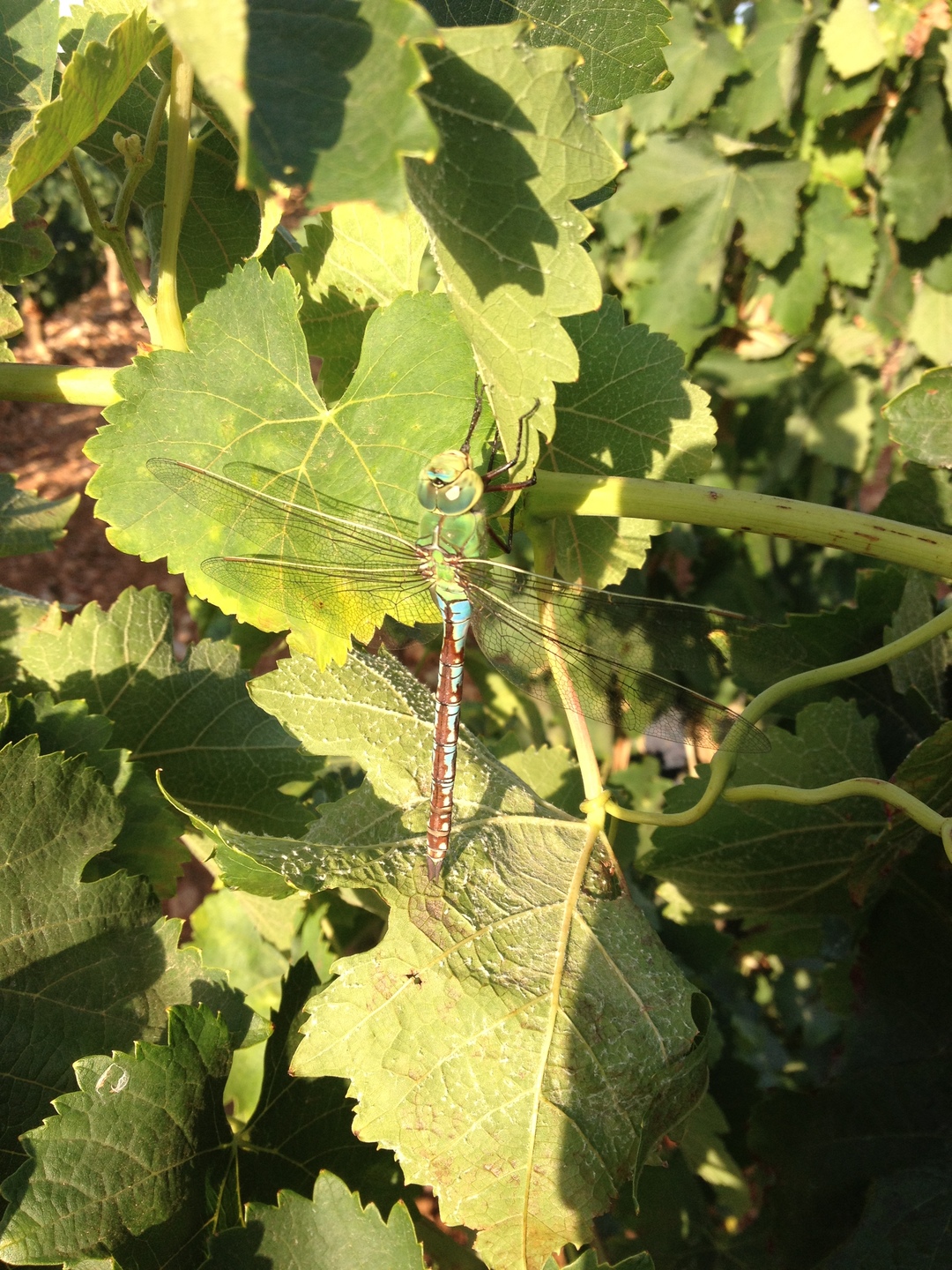 L’altre dia, quan vàrem anar a les vinyes de Gallinas & Focas a recollir el nostre primer raïm de taula (sí, el primer!) ens vàrem sorprendre amb dues imatges que volem compartir amb els nostres amics… Un ocell que fa pocs dies que ha sortit de l’ou i que descansa entre les fulles i una libèl·lula (i no precisament petita) que sembla que vigila la bona maduració del raïm. Coses de l’estiu.