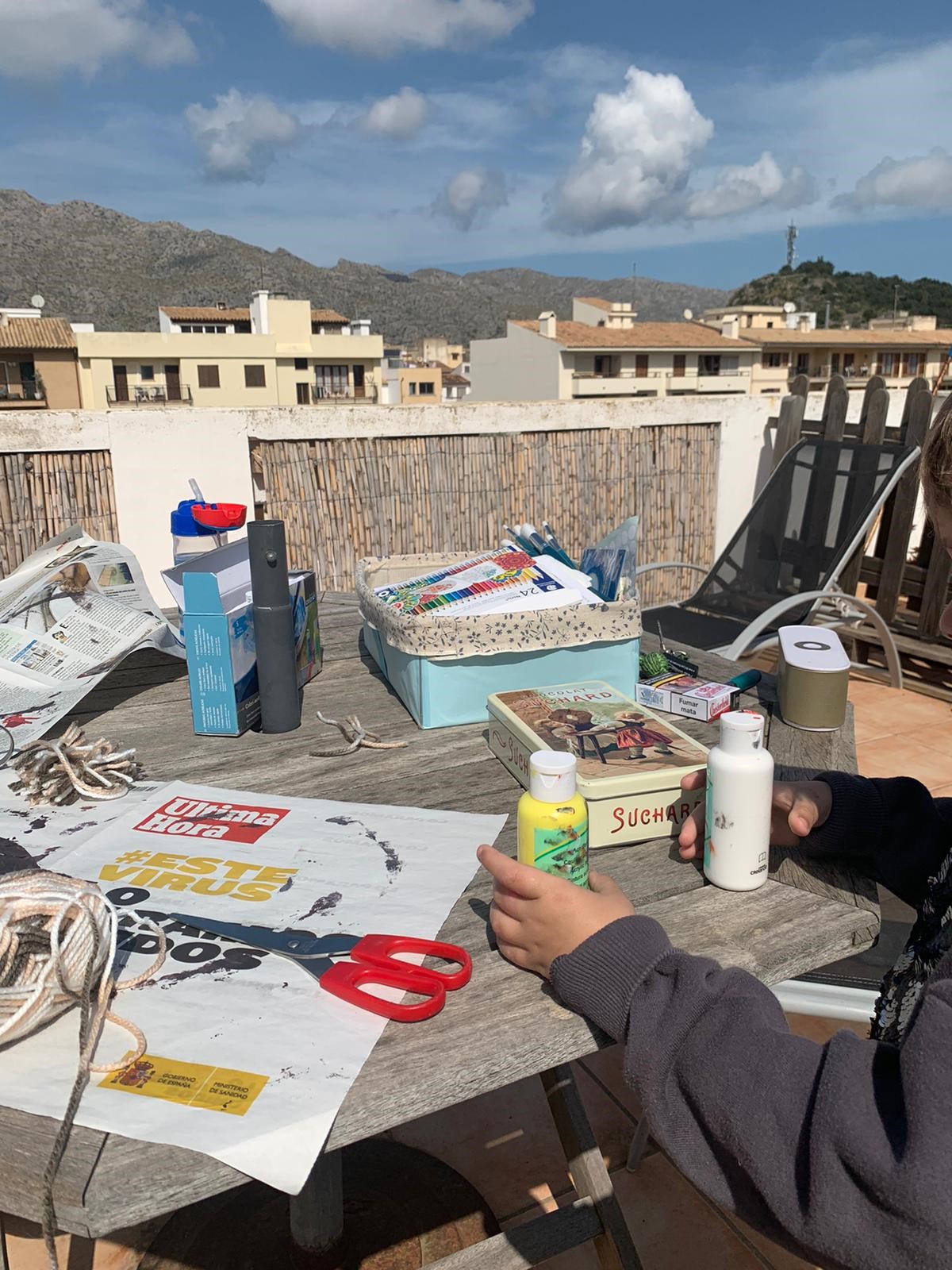 Ara feim sessions i seguiments per Skype, per videocridada, per zoom… amb les famílies i amb els nins i nines. Aprenem tots i, més que mai, que la pràctica centrada en la família està present. Aprenem que de les activitats més quotidianes i amb els materials més propers podem crear realment móns imaginaris com caçar dinosaures des del balcó a les muntanyes de Pollença, o fer animalets dels calcetins que ja ens queden petits. Totes les àrees del desenvolupament s’activen i estan presents.