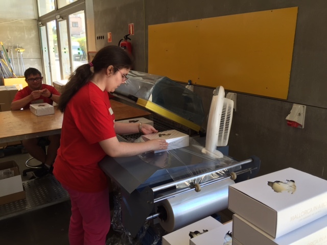 Esment Impremta trabaja en el manipulado del producto Mallorca in a Box, una iniciativa dirigida a turistas que quieran llevarse un pedacito gastronómico de la isla. La caja se compone de varios productos y su manipulado y composición permite la participación de un grupo de personas que trabajan en el área de la imprenta.