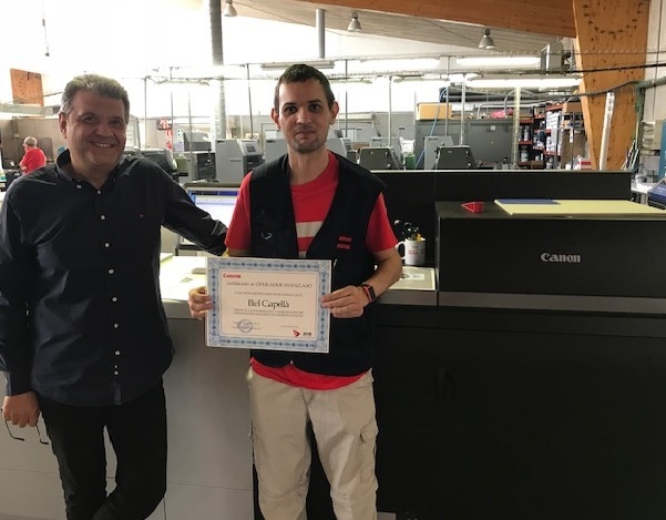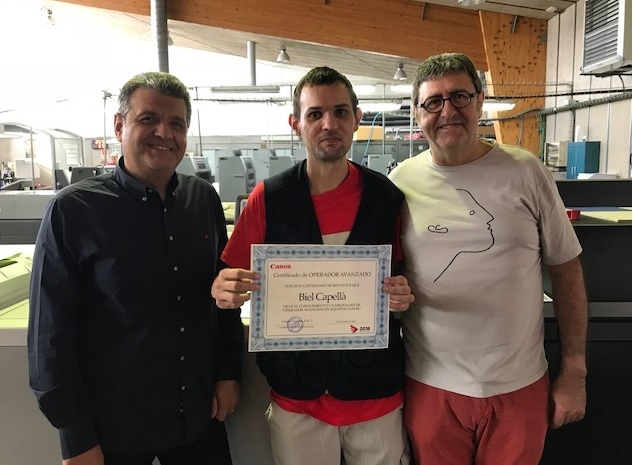En la imagen, nuestro compañero Biel muestra su título de operador avanzado acreditado por la empresa Canon y está acompañado por Julià Ferragut y por Pep Balaguer. ¡Enhorabuena, Biel!